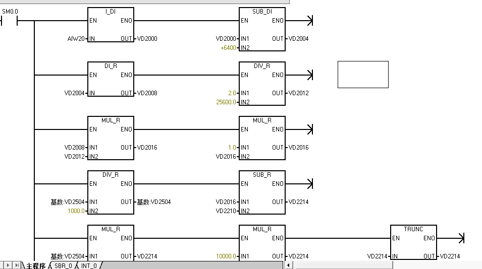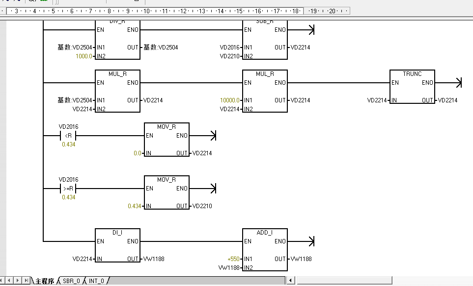 西門子200PLC測罐內液位罐體是550升的,這段程序最終給出的單位是升,底部壓力液位變送器給出4-20MA信號,液位變送器量程是0-2米,這個程序中用2除以25600是啥意思,還有這個基數是干啥的起什么作用,還有這個0.434起什么作用,各位老師幫忙分析一下,謝謝