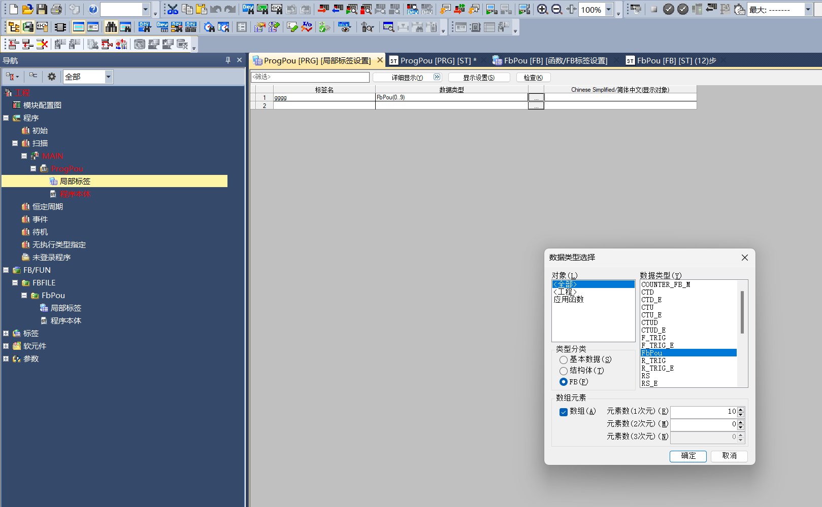 幾十個(gè)的軸功能塊要一個(gè)一個(gè)填引腳的話太浪費(fèi)時(shí)間了,能用數(shù)組來實(shí)現(xiàn)嗎?已知基恩士的PLC是可以實(shí)現(xiàn)的,三菱的數(shù)據(jù)類型里面也有數(shù)組+功能塊,但就是語法寫不出來,