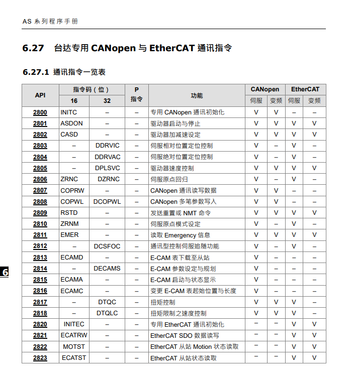求助,現在有一臺臺達AS228T的PLC要與臺邦星普伺服進行canopen總線控制,當前情況為通訊已連接,查不到臺達的canopen通訊指令,無法實現用canopen控制伺服回零,絕對定位等運動,求助各位大神,臺達與其他品牌伺服的通訊要用什么指令,canopen通訊初始化,寫入速度,脈沖,加減速等如何實現