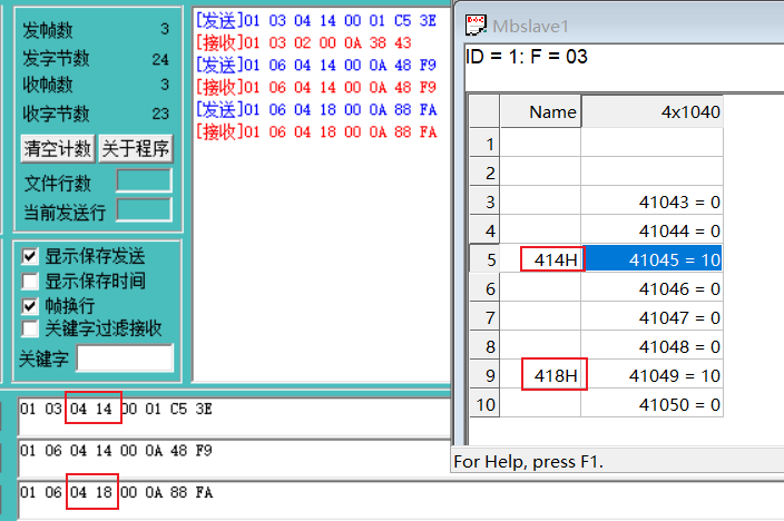 03讀  [發送]01 03 04 14 00 01 C5 3E  [接收]01 03 02 00 0A 38 43