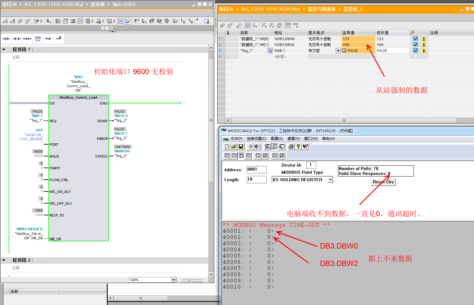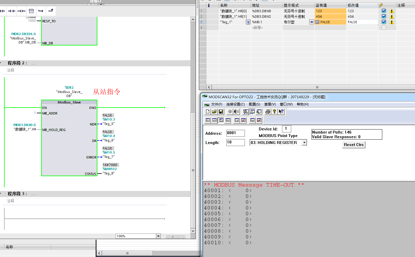 如上圖,上圖是通訊連接圖和實物圖,現在1241的通訊卡,指示燈一個也不亮,但是主機還可以識別到1241,因為CPU的診斷紅燈沒有亮,但是這個卡指示燈不亮。我用電腦端的MODSCAN做主站,1200做從站,從站設為地址2,但是電腦端收不到數據上來,現在不知道是程序的問題呢,還是通信卡就是壞的。。。我找了200SMART的主機做個一個測試,可以輕松讀數據上來,但是換這個1200就是讀不上數據來,這是什么原因,謝謝大家