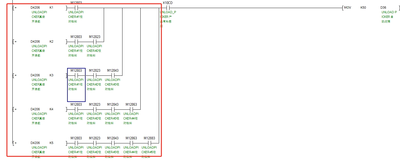 在連續(xù)多個段落串聯(lián)了大量的相同軟元件,太占用屏幕空間了。我優(yōu)化程序的時候都會用一個繼電器轉(zhuǎn)接一下。