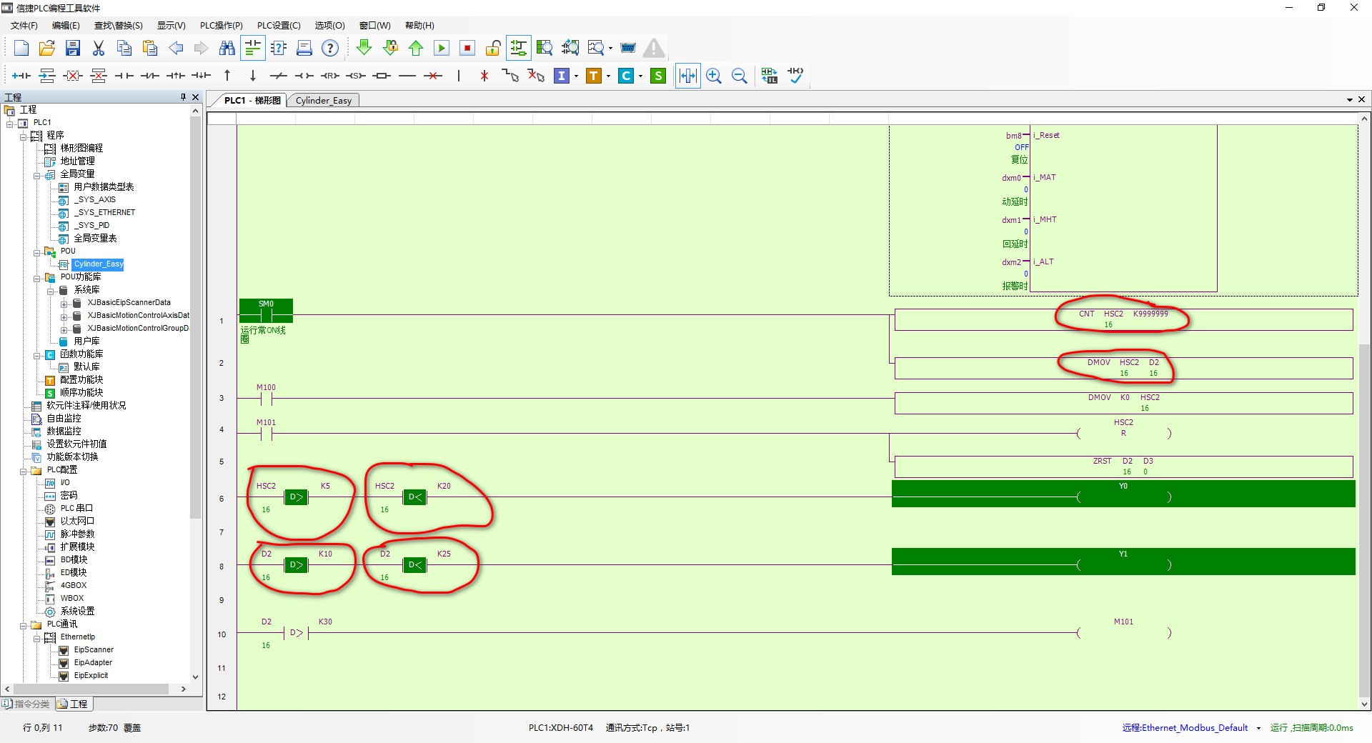比如你程序中跟k5比較時hsc是50,跟k20比較時hsc為-50,那就會意外導通y0一個周期