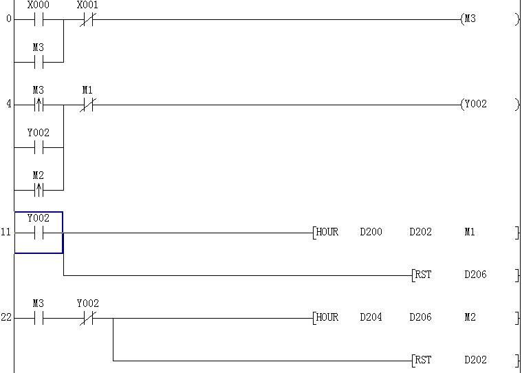 如沒有實時鐘模塊,可以用M8014配合浮點加法指令,做2個以分鐘為單位的數據累加器,5小時=300分、1小時=60分鐘,就可以解決。