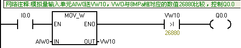 要求:量程為0~10MPa的壓力變送器的輸出信號為直流4~20mA。系統控制要求是,當壓力大于8MPa時,指示燈亮,否則燈滅。設控制指示燈的輸出信號為Q0.0。