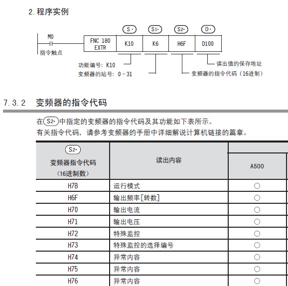 用RS指令時(shí)讀取電流值可以參考三菱官網(wǎng)的PLC與變頻器通訊的樣例程序。