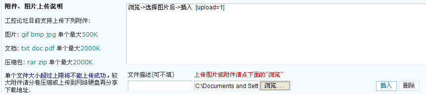 瀏覽->選擇圖片后->插入 ;圖片大小不要超過論壇限制