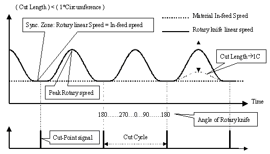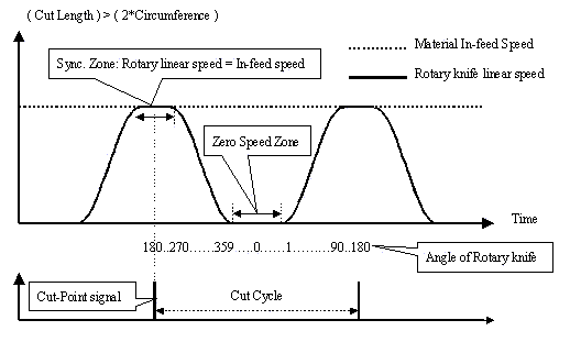 2. 經過PDS-RC控制系統精確的計算、控制,在「裁刀速度」上升到一定值之後,立刻開始減速;務求在「裁刀速度」下降到與「進料速度」同步的同時,「裁切刀輪」也恰好進入「同步區域」;並維持同步直到第二個「裁切點」出現,乃完成一次「裁切循環」。