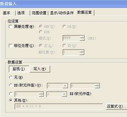我來回復,你試一下就知道行不行了,反正我是這么做的就行:在數值顯示里選數據運算,在監視里選其它,點運算式后選(A.B).C,再選擇下面公式成為A*B+C,再點B,選擇常數為0.1就OK了。