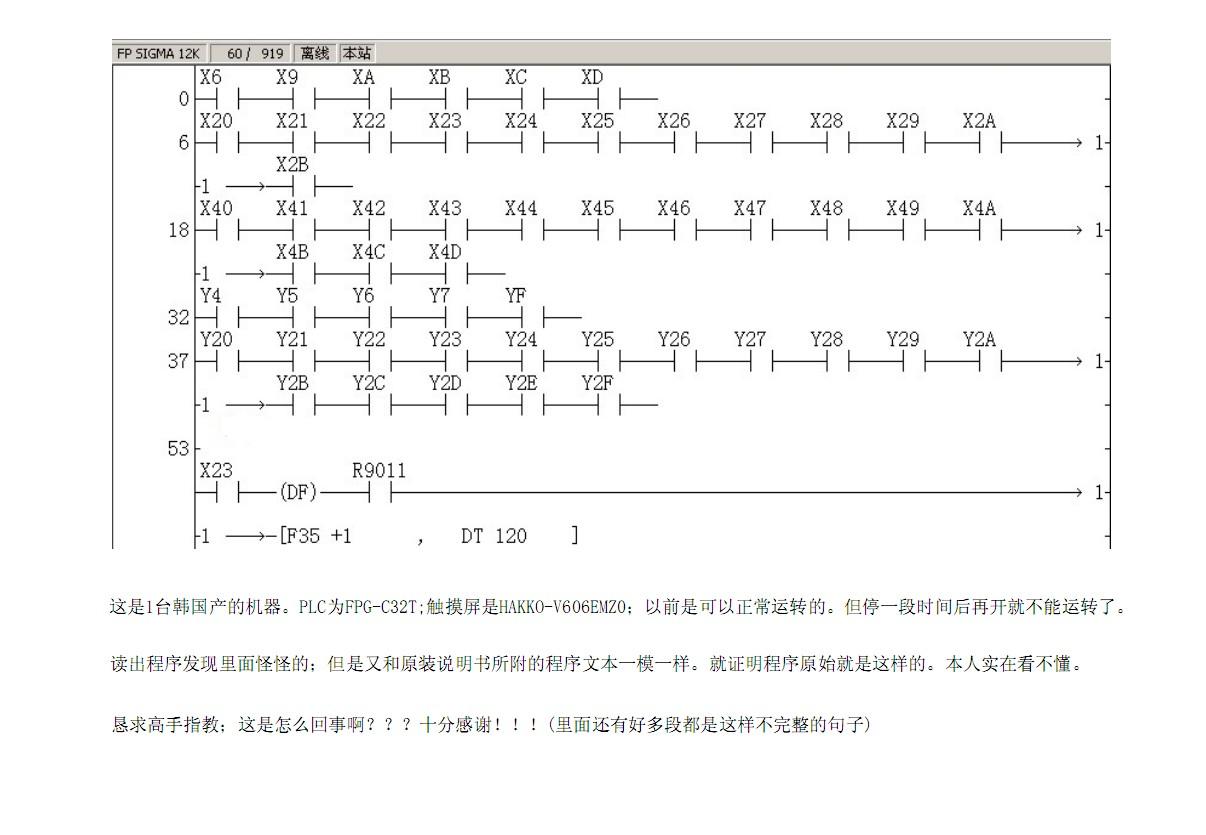 看它怪,這只能說明你沒學(xué)過PLC編程.PLC的梯形圖基本都是這樣.你這個(gè)梯形圖邏輯與的關(guān)系太多.可以簡(jiǎn)化程序.機(jī)器原先是好的,只是放了一段時(shí)間,再使用就有問題.首先你要檢測(cè)輸入條件完全嗎?都正確嗎?再看看輸出是否正確?對(duì)照設(shè)備信號(hào)I/O示意圖,監(jiān)控程序.查看輸出點(diǎn)是否有?看輸入條件信號(hào)點(diǎn)是哪個(gè)沒滿足.就查哪個(gè)外圍輸入開關(guān).你也就會(huì)修設(shè)備,也知道為啥不啟動(dòng)的問題點(diǎn)在哪?