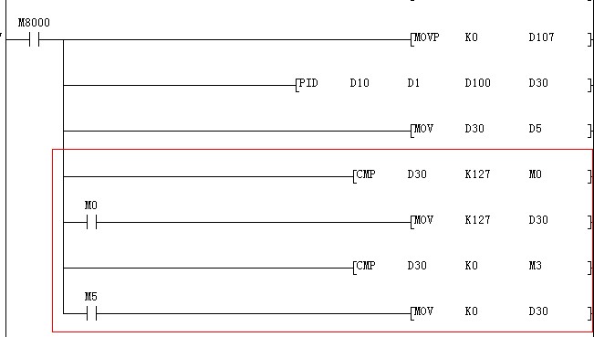 寫的是一個輸出脈沖的PID控制,看著不完整,將D30傳送到D5后,下面的程序是清零操作嗎?為什么要這樣?