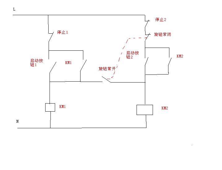 請容我分析你的線路:你的圖可以實現兩臺電機獨立的啟動和停止。當旋鈕常開點閉合的時候能實現同時啟動和停止。但沒有達到先后起停的目的。況且題目所給的元件中沒有旋鈕。