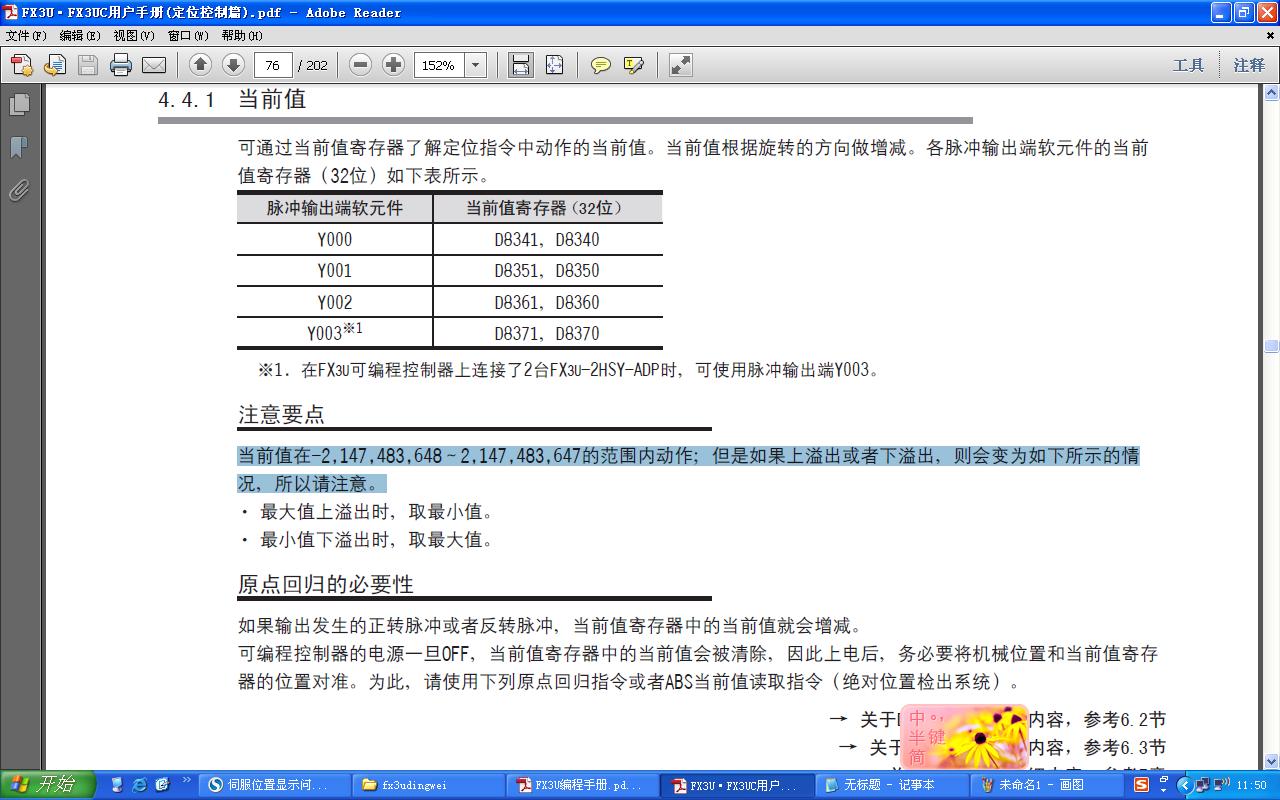 這個其實很簡單,在開機上電時手可以推動馬達,是因為寫程序的人剛開始沒讓他使能。按回原點先使能后再作回原點操作。一般PLC感應到原點信號時都會把脈沖現在值清零。也就是D8140低位, 應該是這個三菱很久沒用了。再屏中顯示只用低位 32位數 有符號型。看到這個給了我一個啟示其實 上電開機時也可以不讓機器勵磁,要求回原點后才能啟動機器自動運行,避免了開機運行沒回原點的情況。