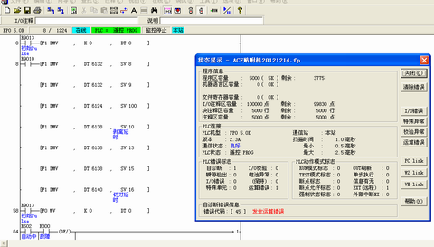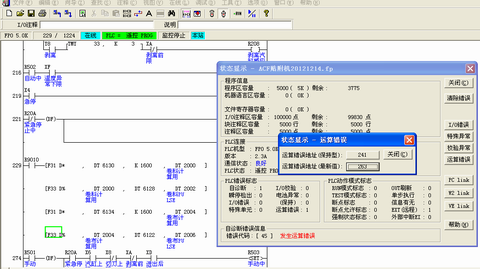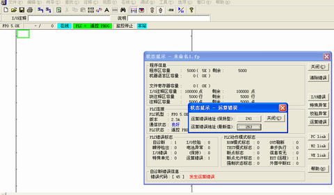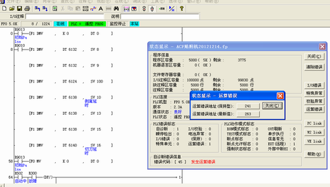 此款松下PLC型號為FP0-C32T,在程序編輯器中無法清除內存,后來重新對PLC進行了強制清除一次,上傳程序后還是顯示運算錯誤;然后又使用空白程序上傳至PLC,但傳送完后同樣顯示PLC運算錯誤,詳細情況請查看圖片。