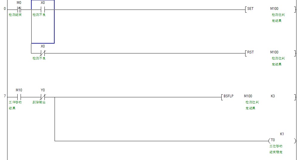 用不良信號在檢測工位檢測結束時置位m位,再用SFTR指令把不良信號傳遞到下一工位
