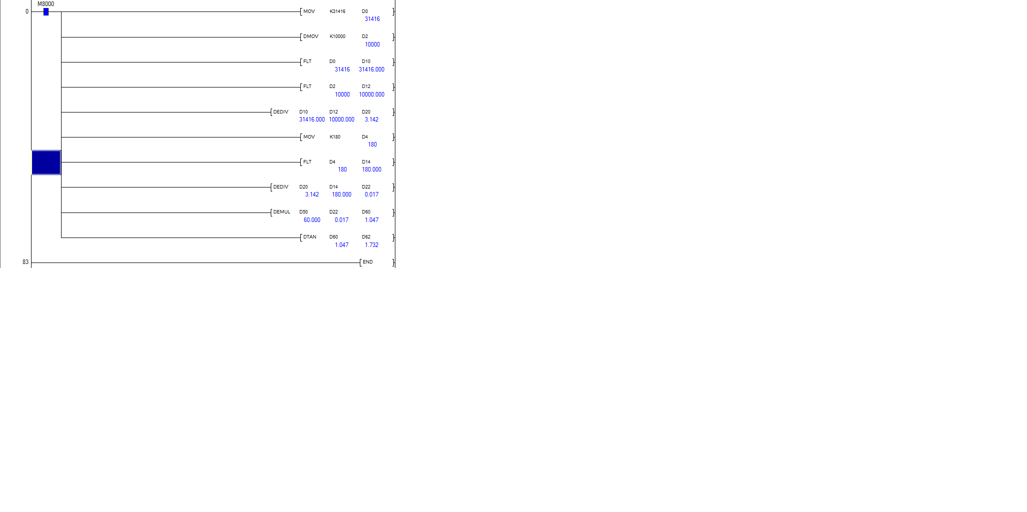 為什么我使用DTAN D0 D10,其中D0的值為60,結果D10是0.32,難道三菱FX2N的DTAN浮點運算是弧度制的?怎么樣才是角度制的?