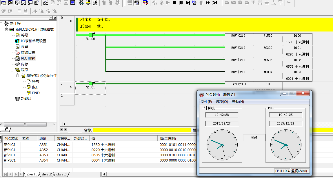 大俠,A351```A354的值是變化了。為什么左側PLC時鐘選項里的沒有變呢?還有為什么W1.00跑到下面去了是為什么啊?