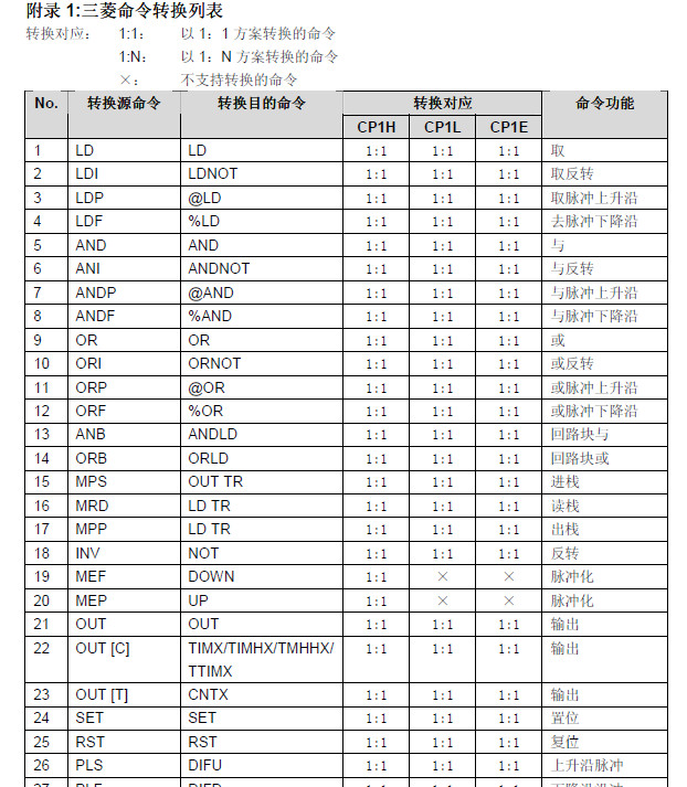 OMRON的軟件,有直接可以導(dǎo)入變換SIEMENS,mitsubishi等的程序功能,但有些指令需要手動(dòng)修改,并不能完全對(duì)應(yīng)變換。 OMRON的手冊(cè),也有對(duì)應(yīng)的MITSUBISHI,SIEMENS指令對(duì)應(yīng)的OMRON的指令的講解和用法。 這個(gè)指令比較對(duì)照在那里找啊,可以對(duì)照學(xué)習(xí)一下啊 |