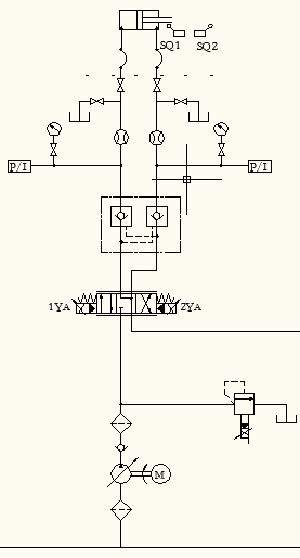 (1)行程開關(guān)SQ1被壓下,液壓缸右行至極限位置按下SQ2,比例溢流閥將壓力調(diào)至2倍額定壓力,保壓2分鐘后溢流閥將壓力調(diào)回默認(rèn)值,液壓缸左行至極限位置壓下SQ1,溢流閥將壓力調(diào)至2倍額定壓力,保壓2分鐘。如此往復(fù)。