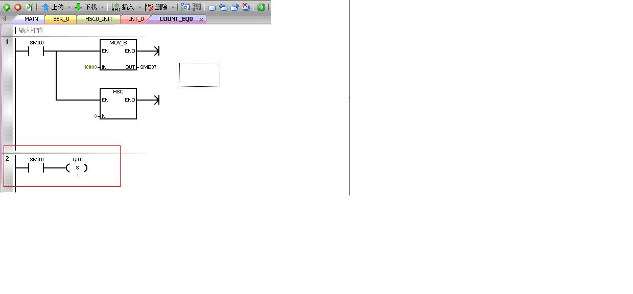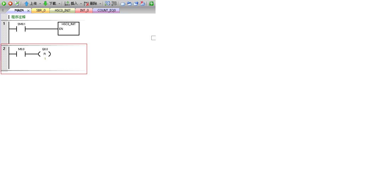 我這里先做一個當高速計數器的當前值等于預設值時,在中斷中啟動Q0.0作為高速計數器數據達到時的標記,并在主程序中允許隨意復位,圖示:
