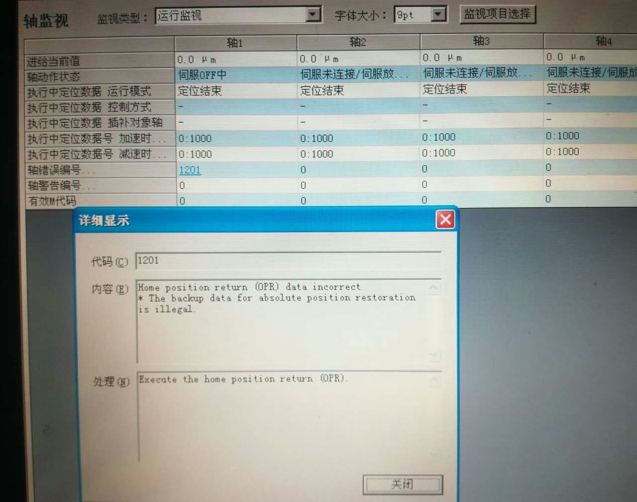 如圖報警1201,好像是回遠點,可是圖上軸一顯示:伺服off中,我程序中Y0已經接通了,不知道咋搞能把伺服開啟,如何把報警解除?求大神指點一下
