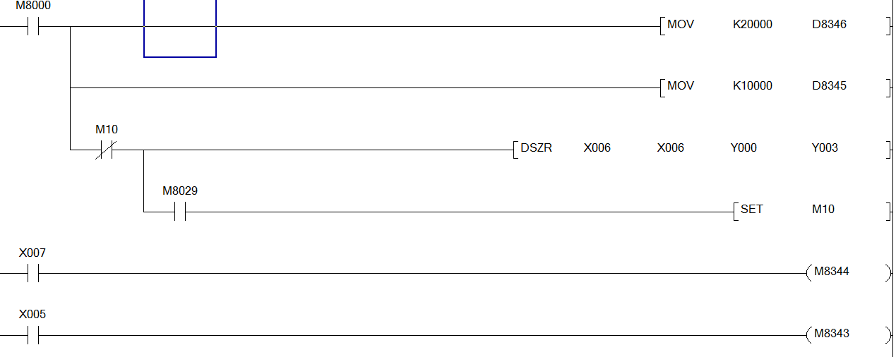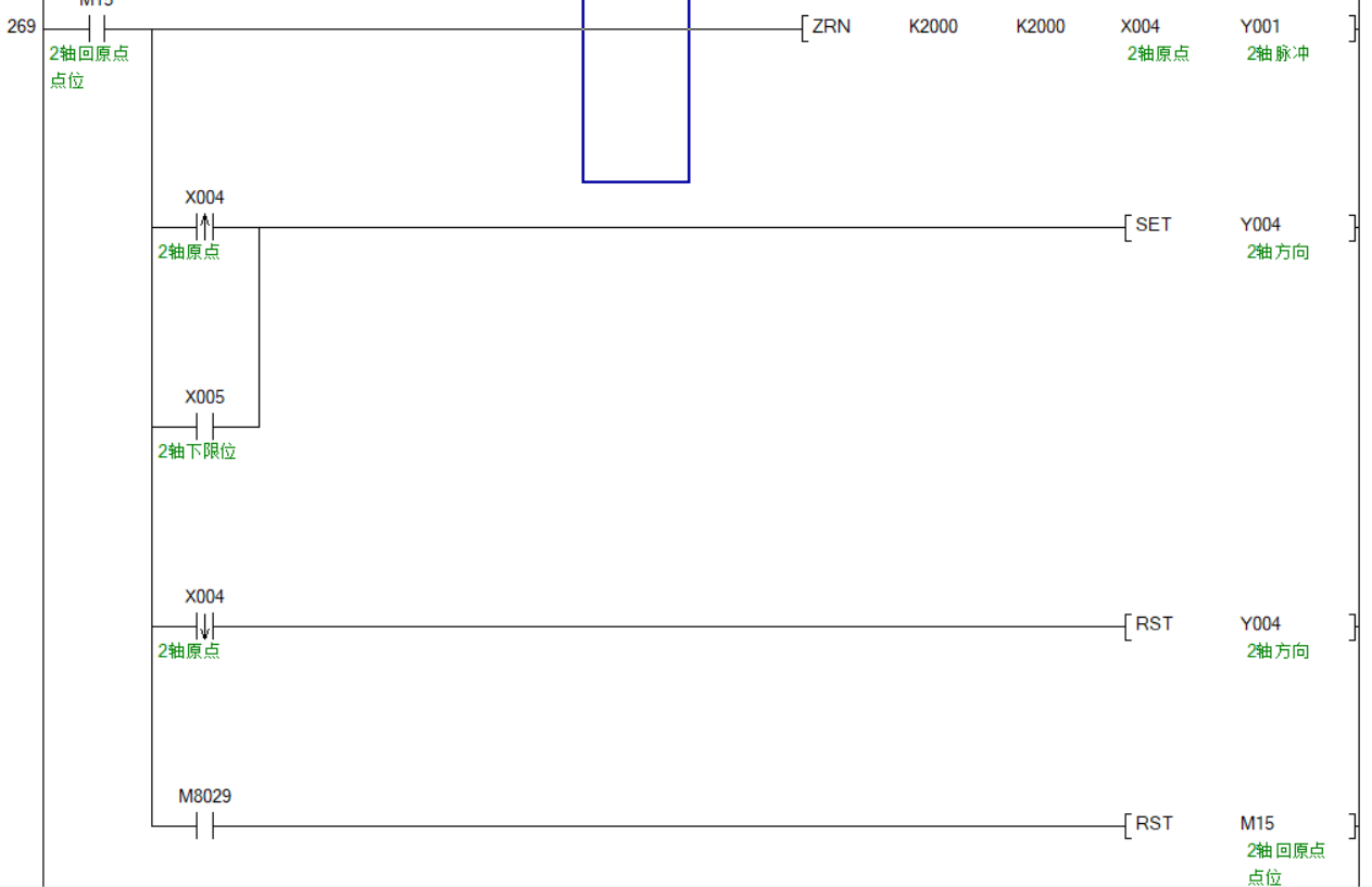 程序有問題,是否考慮上下限位的問題,如果機構在上限位與原點之間呢。回原點是會錯誤的。而且這樣直接改變方向的做法也欠妥。如果是有上下限位,可以考慮用DSZR指令回原點。可以幫你寫一點