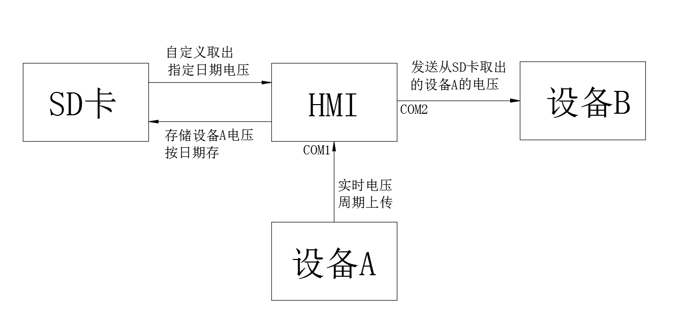 下位機(jī)的內(nèi)存不夠大,產(chǎn)生的數(shù)據(jù)從COM1發(fā)送到觸摸屏,觸摸屏放在SD卡保存,當(dāng)有需要時(shí),可以將指定的數(shù)據(jù)從SD卡取出轉(zhuǎn)發(fā)到COM2。
