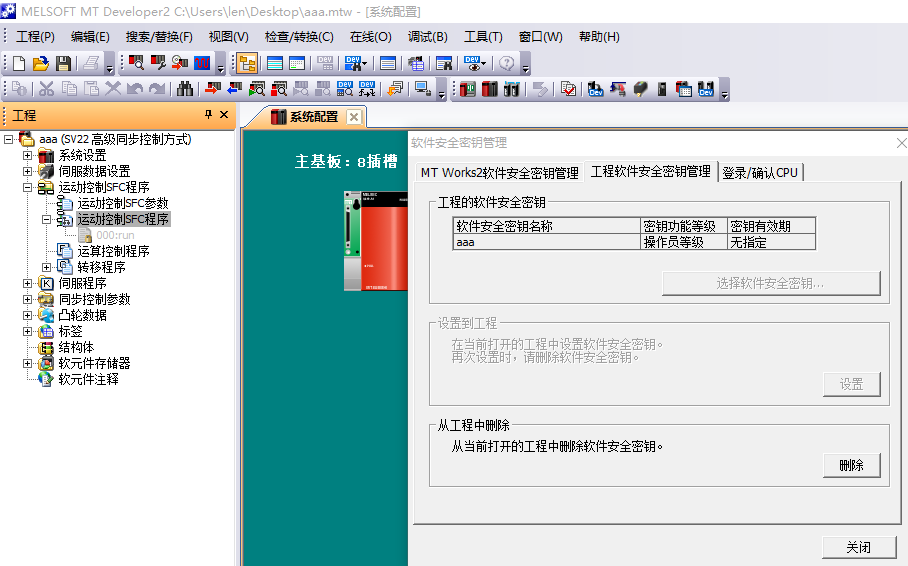 MT軟件安全密鑰(Security Key)加密。 當(dāng)然,這些也有辦法解密了! 但沒幾個(gè)人能解,用這兩種加密,相對(duì)來說,安全系數(shù)高些。如下圖,SFC已加密。 MT軟件安全密鑰(Security Key)也加密,并設(shè)成 了操作員權(quán)限,從而使得其它沒有安裝本密鑰文件aaa的電腦無法打開本工程文件,更無法從Q173DSCPU上載本程序。