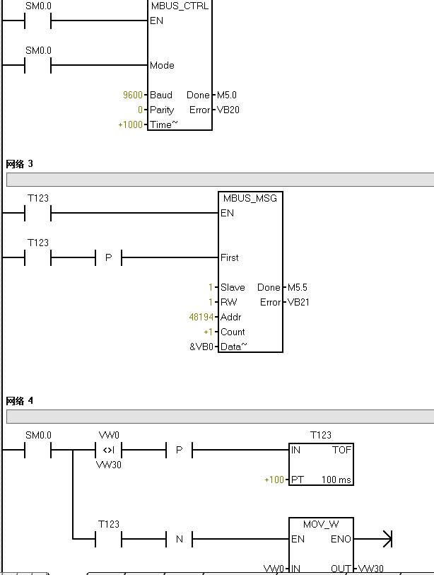一臺機器用西門子S200 與2臺英威騰GD200系列變頻器通訊,只設置頻率,運行由端子控制。程序與大家分享,也有些疑問:網絡3中,Addr 不是設置變頻器頻率(H2001)的地止嗎?!48194是什么意思呢?   &VB4是什么意思呢?怎么有一個&?網絡4中,VW0不等于VW30時,斷開T123,從而保存新的設置數據。但是T123前面延長會有一個上升沿信號呢?5里面還有一個子程序,里面是加了密還是自動生成的一個文件呢,怎么沒有內容提要呢?