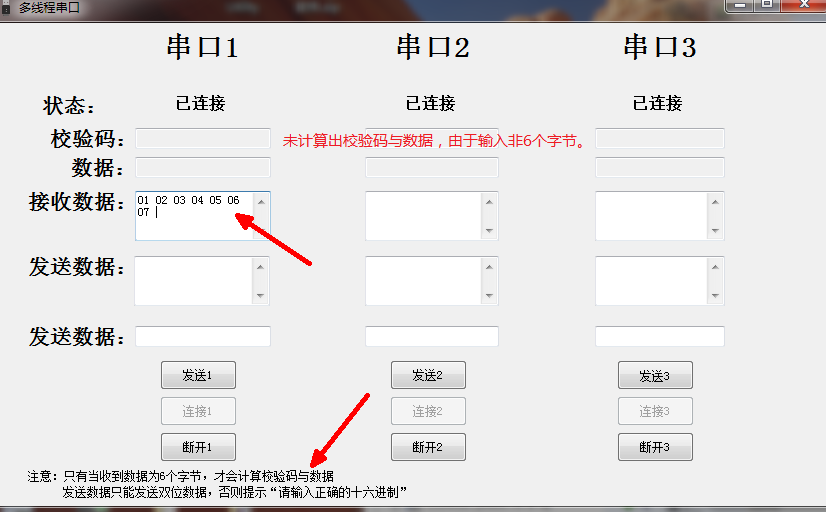 分享一個本人自己做的多串口調試軟件,支持3個串口同時測試,自動計算消息頻為6個字節的16位校驗碼,同時計算出第5以及第6字節的數據大小。