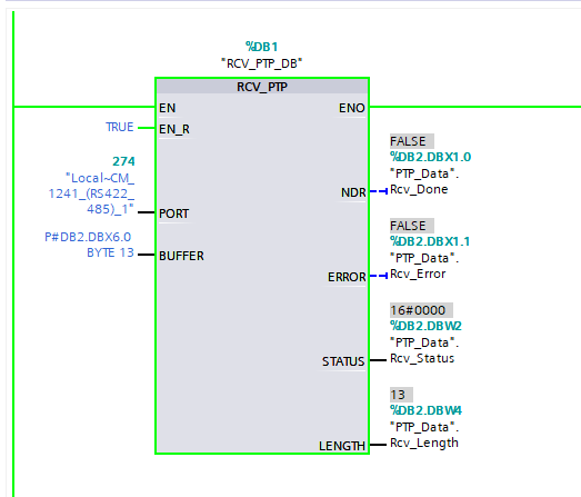 這里還想問下RCV_PTP和Receive_P2P功能塊的區別,我現在用的是RCV_PTP,說明里說EN_R在上升沿啟用接收,但是我實際發現一直給TRUE也是可以接收的。我使用Receive_P2P就沒有接收成功過數據,這是什么原因?