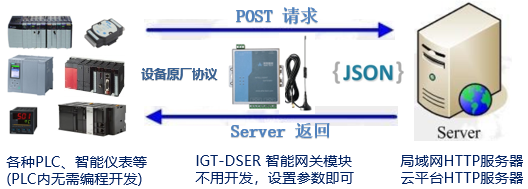 智能網(wǎng)關(guān)IGT-DSER集成了多種PLC的原廠協(xié)議,方便實(shí)現(xiàn)各種PLC與服務(wù)端之間的HTTP協(xié)議通訊,通過網(wǎng)關(guān)的參數(shù)配置軟件綁定JSON文件的字段與PLC寄存器地址,配置URL,選定周期模式或者觸發(fā)模式,即可通過POST命令,將JSON文件提交給HTTP的服務(wù)端; 如果服務(wù)端有返回的JSON,網(wǎng)關(guān)進(jìn)行解析后將數(shù)據(jù)寫入到PLC,實(shí)現(xiàn)PLC與HTTP服務(wù)端雙向通訊。