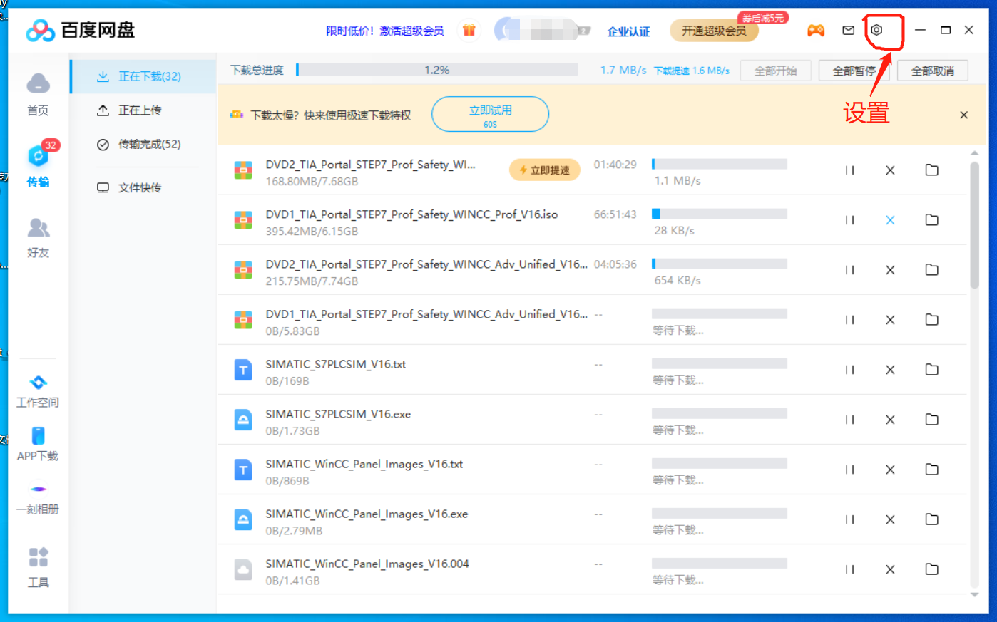 想在百度網盤下載個博圖V16,看著每秒100KB下載速度頭疼,在網上搜了個提速方法分享給大家