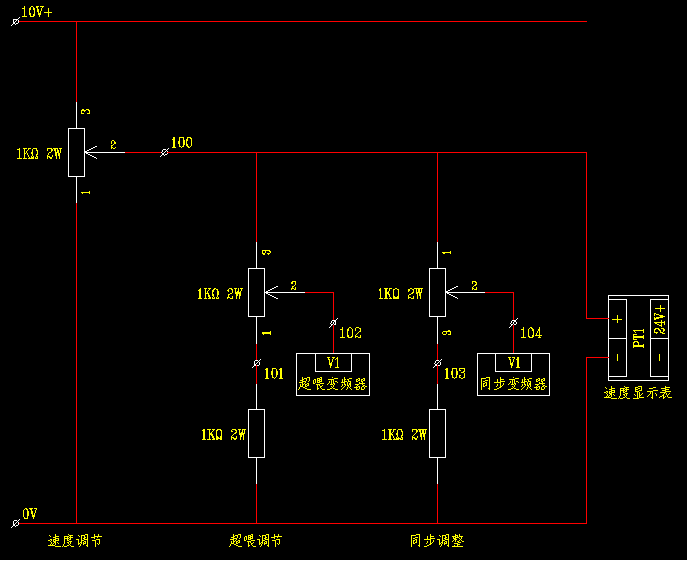 請(qǐng)看圖,第一個(gè)電位器為總的速度調(diào)節(jié).第二個(gè)超喂調(diào)節(jié),在反轉(zhuǎn)的時(shí)侯調(diào)至最低,防止反轉(zhuǎn)時(shí)同步變頻速度跟不上卡住布.第三個(gè)同步電位器安裝在張力桿上,起與主變頻速度作自動(dòng)調(diào)節(jié)的作用.張力的大小控制可以用氣缸通過調(diào)節(jié)閥作調(diào)節(jié).
