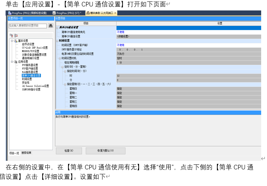 在右側(cè)的設(shè)置中,在【簡(jiǎn)單CPU通信使用有無(wú)】選擇“使用”,點(diǎn)擊下側(cè)的【簡(jiǎn)單CPU通信設(shè)置】點(diǎn)擊【詳細(xì)設(shè)置】。設(shè)置如下