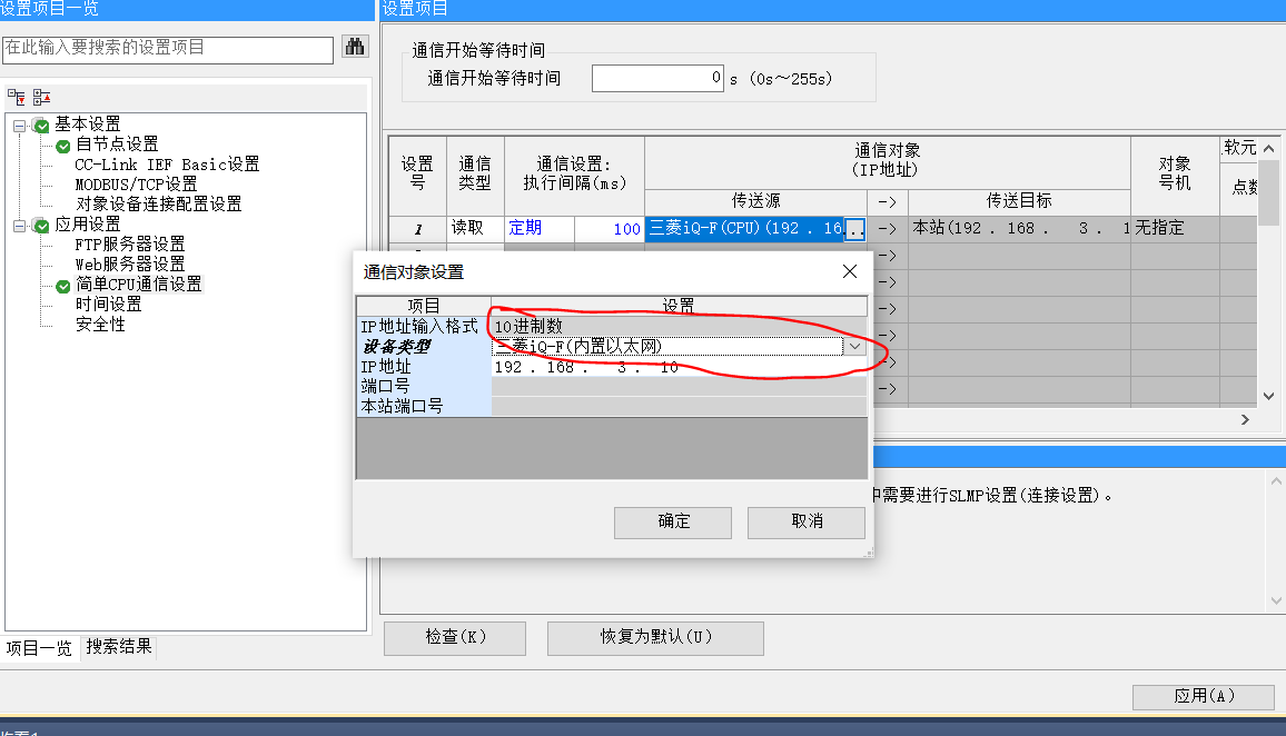 本通信適用三菱帶內(nèi)置以太網(wǎng)的CPU,具體設(shè)置如下: