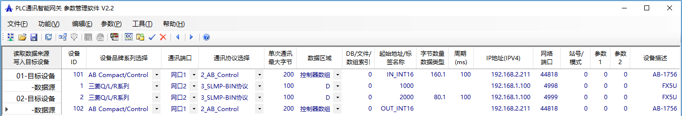 首先打開(kāi)參數(shù)設(shè)置軟件(在附件中)通過(guò)'功能'->'網(wǎng)口參數(shù)編輯'設(shè)置網(wǎng)關(guān)模塊自身的IP地址等網(wǎng)絡(luò)參數(shù),再通過(guò)'功能'->'PLC之間通訊'進(jìn)入PLC之間通訊的數(shù)據(jù)配置頁(yè)面,以下是已配置完成的羅克韋爾(AB)與三菱FX5U設(shè)備之間的通訊數(shù)據(jù)配置: