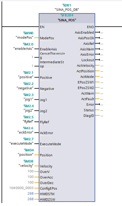 更進一步,使用FB284來控制伺服,這控制字你也不用管了,把需要的定位功能往它管腳上拖就行了。