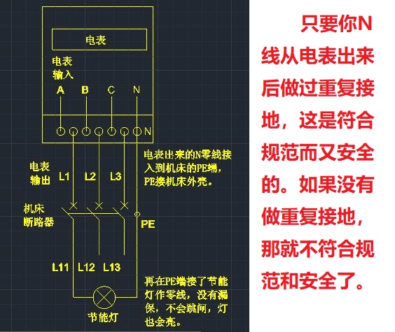 電表出來就四根線,再分出10多個(gè)DZ47的斷路器,每個(gè)DZ47接一臺(tái)數(shù)控機(jī)床,零線就接配電柜的N接線排,再四線制到數(shù)控機(jī)床,從配電箱N接線排過來的接到數(shù)控機(jī)床的PE端,(再從數(shù)控機(jī)床的斷路器下面接出一根火線,PE處接出一根作節(jié)能燈的零線)數(shù)控機(jī)床安裝在三樓,沒看見有地線,就是這么一個(gè)情況。 在PE處接出的線作節(jié)能燈零線,萬一火表出來的N斷線,那10多臺(tái)機(jī)床外殼都帶電了。