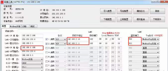 1、2臺S7-200 SMART的PLC的IP地址,同時映射到IP:192.168.1.188,通過端口502和503區分;