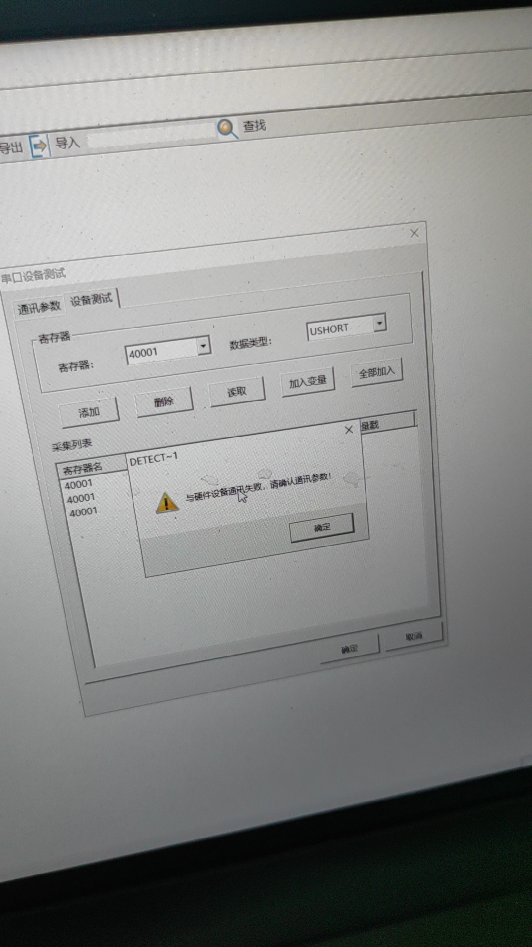 2、用組態王Modbus單個測試40001或40002顯示失敗,單獨做一個測試工程將40001~40007一并可讀取,(儀表的通訊協議是一次讀取7筆,少或多都會導致數據返回錯誤),但加上其它站點時仍舊失。ㄗⅲ赫咎栐O置是正確的,無重復站點)
