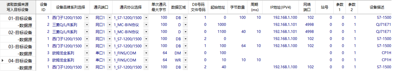 配置完成上述數據交互任務需要4個任務條目,共8行數據,配置好參數后下載到網關。重啟網關之后,網關根據任務條目,連接3臺PLC設備運行。