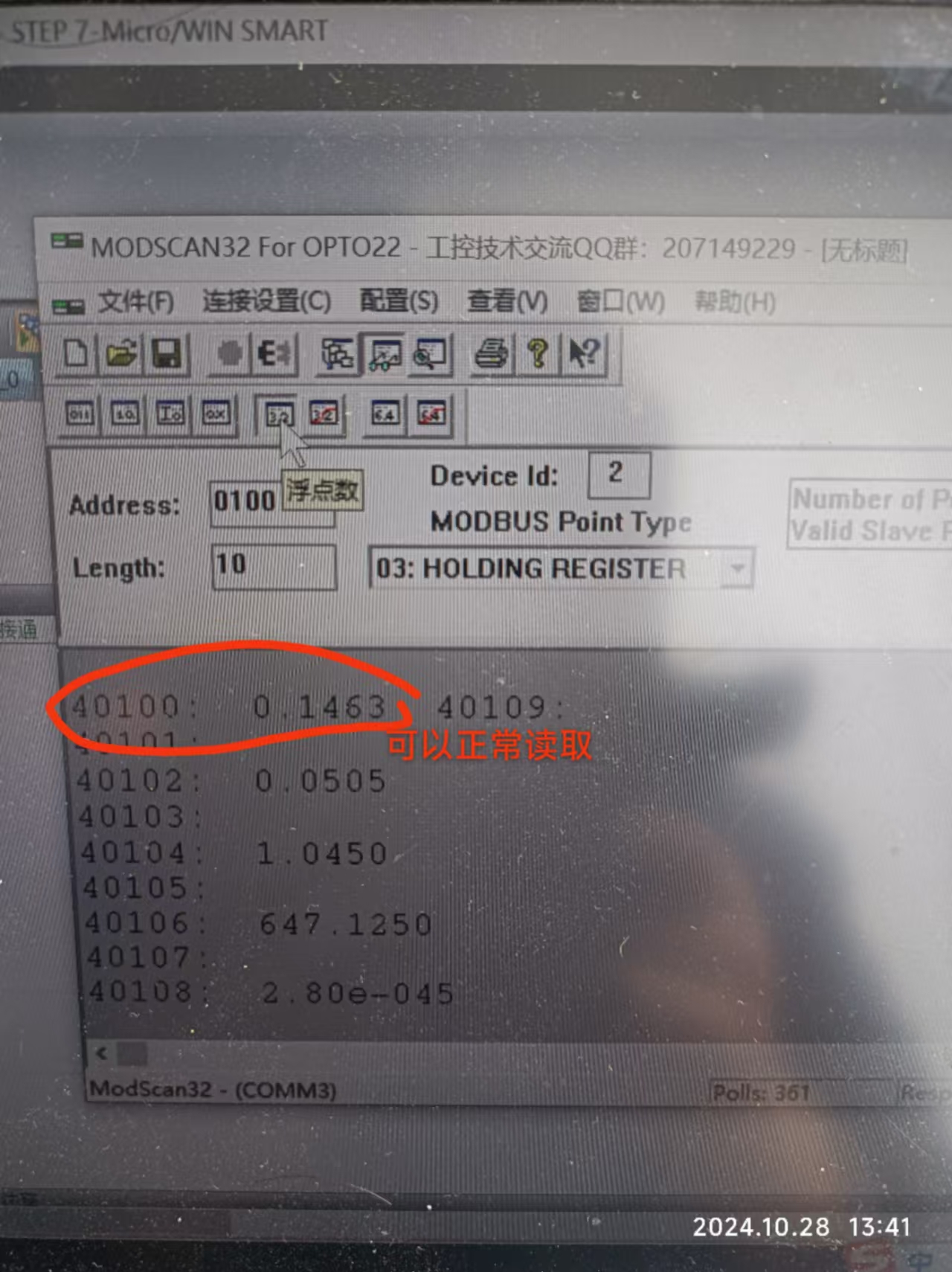 這個是用兩個地址(2個字)存的浮點,把40100和40101同時讀取上來,再到PLC里面將兩個字合為浮點進行顯示和運算就好了