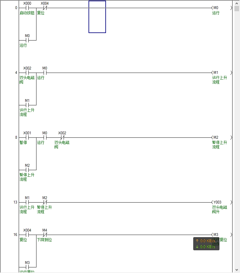 用一個X2控制雙頭電磁閥的兩個y點輸出,進行氣缸的升降