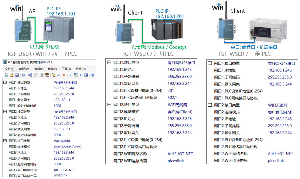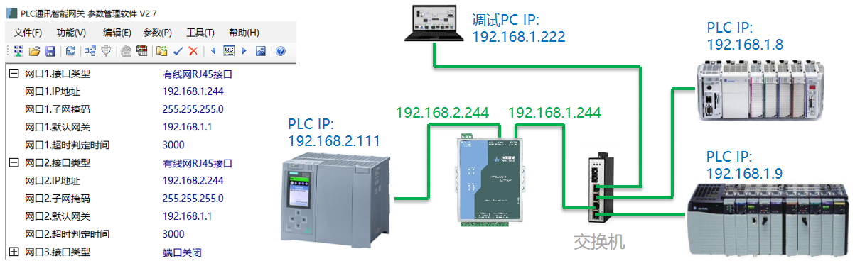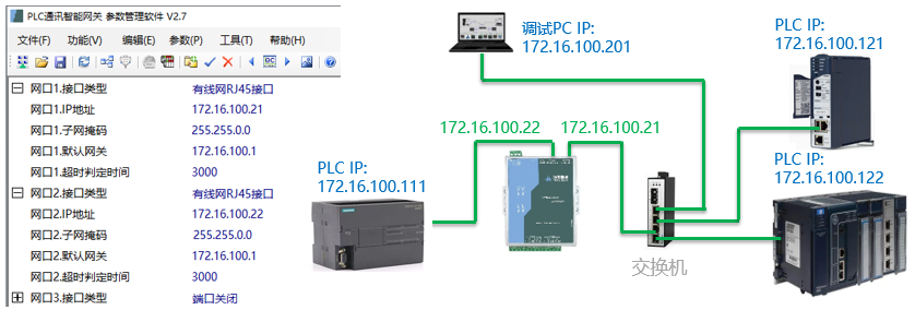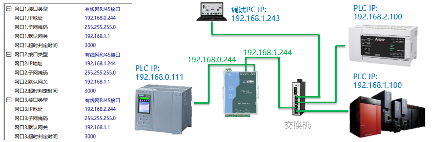 三、多網段的PLC之間通訊: IGT-DSER智能網關的兩個網口設置為不同的網段,同時開啟網口3設置為第三網段,該智能網關沒有實際的物理網口3,自動將IP綁定到物理網口2,作為網口2的第二IP。