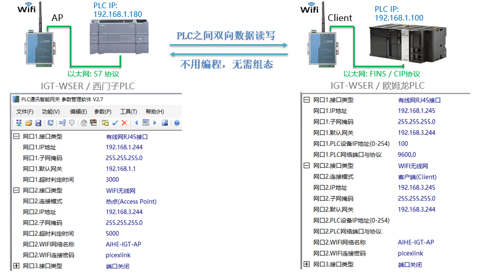 二、跨網段的PLC之間通訊: IGT-DSER智能網關的兩個網口設置為不同的網段,每個網口是獨立的不同網段的子網。