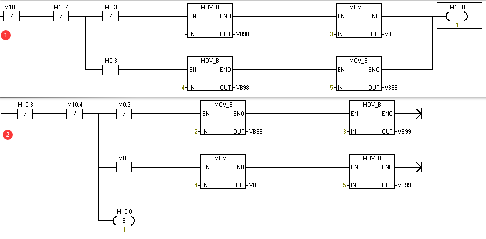 這兩種寫法,都在一個掃描周期內輸出結果,無論掃描先后,對于不是重復掃描的對象(重復掃描的對象以最后掃描的狀態為準),兩種結果都一樣,不會有區別。