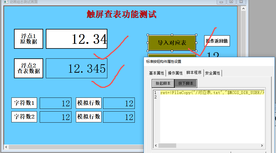 第二步,做一個畫面,把剛才的變量顯示出來。注意第一個浮點數要可輸入的,其它顯示即可。在下載到真實觸屏前,需要加上導入導出按鈕,方便把處理好的對應表放到觸屏里。應用文件復制腳本,詳細請在軟件內查看幫助文件,不多介紹了。