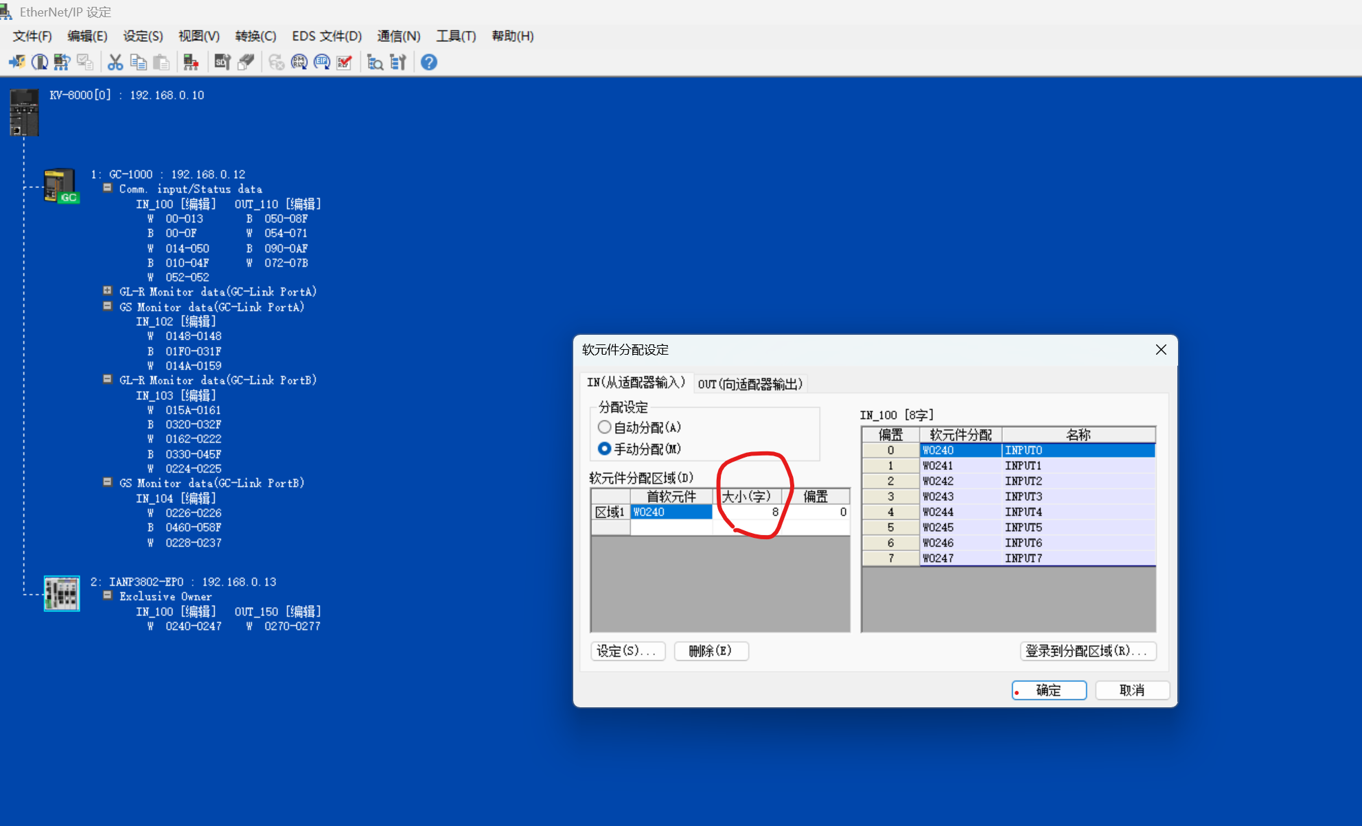 但是在配置過程中,發現它這個軟元件分配區域大小是固定8字,我重新安裝了EDS文件也是同樣的
