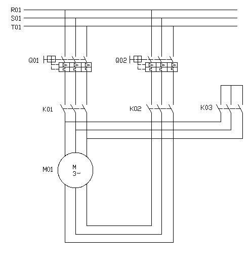 這個是雙速電機來的。K01接通時(三角形)是低速,K02,K03接通時(雙星)是高速運轉。